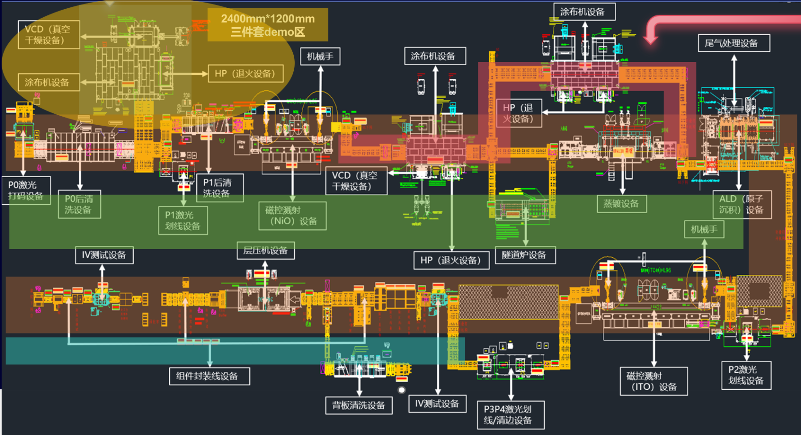 圖. 德滬鈣鈦礦研究院中的2.4m*1.2m涂膜-VCD-HP三件套+機械手的大尺寸全自動涂干烤區(qū)域(黃色部分)